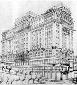 L'immeuble comporte tout ce qu'il y avait de plus luxueux dans les Années Folles : portes en pin de Riga, escaliers en marbre de Carrare, miroirs et papiers peints de Belgique, sanitaires d'Angleterre, ascenseurs de Suisse, fresques murales d'artistes italiens et pas moins de 40 km de corniches en plâtre. En ce qui concerne la façade externe, la partie basse est en granit rouge ; les étages supérieurs, eux, sont recouverts d'un mélange (trois tons de rose) fait de sable extra-fin de Provence, de verre pilé, de cristal de roche et de particules de mica (qui font scintiller les murs à la tombée de la nuit). La toiture est en ardoise.