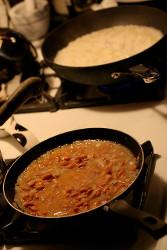 Dans une poêle, faites revenir l'oignon et l'ail. Versez ensuite une louche avec l'eau de la cuisson des haricots et une louche avec les haricots cuits. Écrasez les haricots et laissez bouillir quelques minutes.