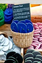 Une large entrée toute blanche d'où se devine un paysage de palmiers, d'énormes lettres rouges en signalétique, attisent irrésistiblement la curiosité du passant de la rue Oscar Freire. Quelques marches plus bas, et on pénètre dans un univers baigné de soleil, de bois et de caoutchouc, de sable et de plantes. Des recoins à thème présentent les différentes collections: les plus populaires, présentées comme sur un marché de fruits et légumes (photo), celles pour enfant sur un puzzle, les tout nouveaux sacs, dans un espace cylindrique, et au centre, le rayon «customisation », où l'on peut décliner à l'infini couleur des semelles, des lanières, et broche décorative. Le mur du fond de la boutique décline les tongs monochromes en un immense arc-en-ciel.