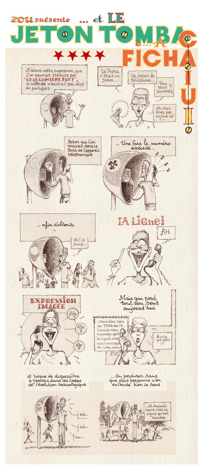 Grâce aux rencontres faites en Afrique, Zou débarque à São Paulo pour la première fois en 1996. Il ne cesse ensuite d'aller et venir entre Paris et cette mégalopole brésilienne qui l'intrigue. Fasciné par les mécanismes des 2 villes, observant les us des uns et les coutumes des autres, il entreprend de tisser le parallèle entre la France et le Brésil avec humour et perspicacité ! Le Brésil devient alors son thème de prédilection et la trame principale de son oeuvre. Mêlés d'une pointe d'acidité et de beaucoup d'affection, les gags de Zou brossent des portraits à la fois tranchants et attachants. Dans le domaine du cliché, ni le français prétentieux, ni le brésilien paresseux n'échappe à l'oeil du dessinateur? c'est son trait calligraphique et son verbe laconique qui fait la différence.