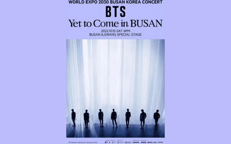 Le groupe ambassadeur de Busan pour cette candidature organise un gigantesque concert intitulé BTS <Yet to Come> in Busan. Ce show se déroulera à partir de 18h (11h heure de Paris) devant 100.000 fans tirés au sort sur une scène construite pour l’occasion, au nord de la ville. Il sera retransmis également sur grand écran au niveau de l’aéroport de Busan, devant 10.000 personnes. Ce concert gratuit sera également disponible gratuitement en streaming aux ARMYs du monde entier depuis les plateformes Weverse, ZEPETO et Naver Now. Une belle action de communication du groupe de K-pop le plus suivi sur Instagram pour la ville de Busan.