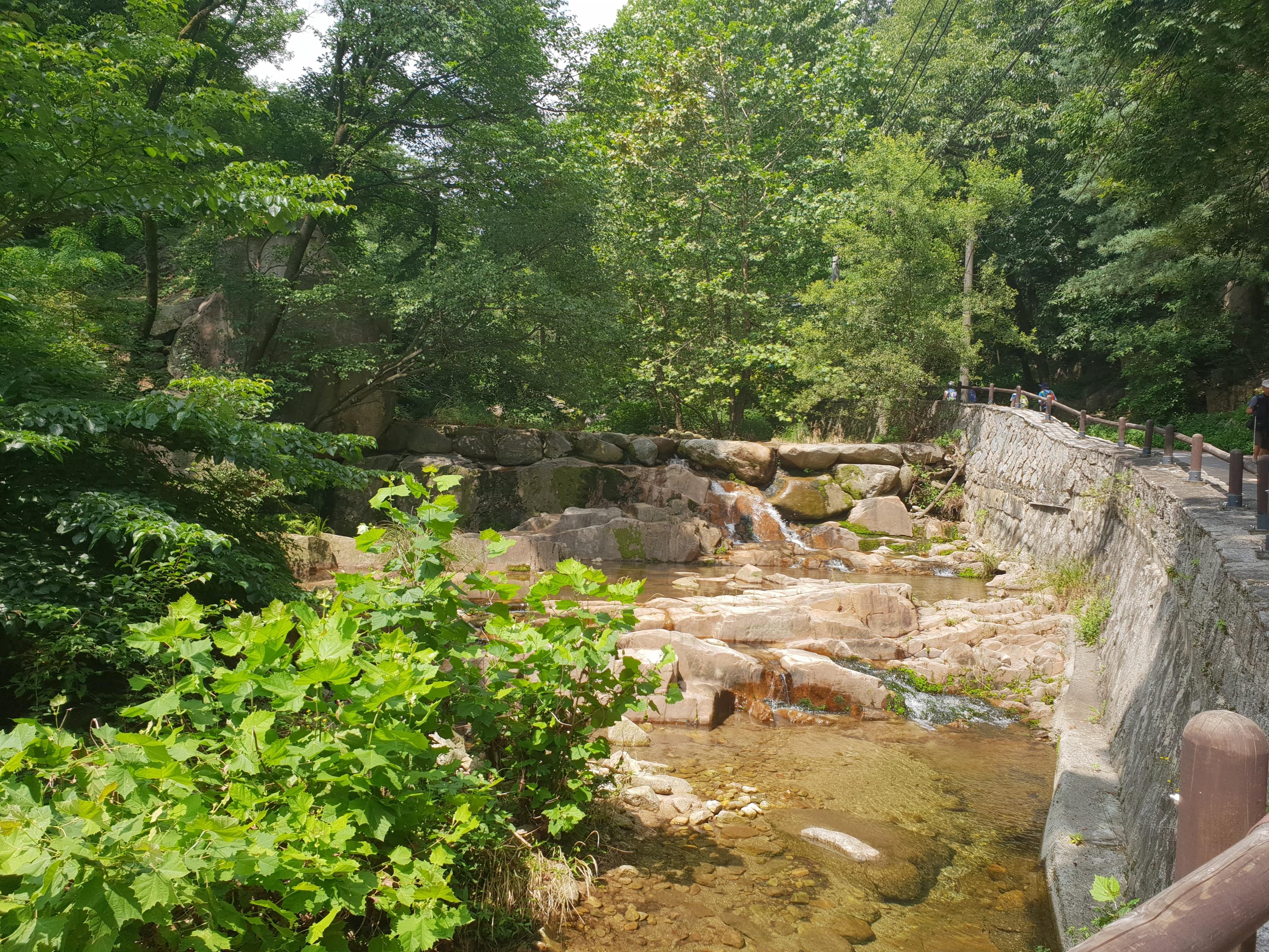Après avoir traversé cette zone commerçante pendant une dizaine de minutes, l'entrée du parc national Bukhansan pointe enfin le bout de son nez. Les choses sérieuses commencent. Les randonneurs peuvent choisir plusieurs itinéraires lors de leur ascension. Le sentier débute par une montée en plein cœur d'une forêt luxuriante dans laquelle coule une rivière à l'eau translucide.