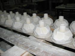 A quelques pas de là, nous entrons dans le hangar de fabrication. Celui-ci s'étend sur 1.000 m2, réparti en zones, chacune étant allouée à une tâche, tout comme chacun des 7 artisans qui travaille à l'usine. Dans ce temple de la perfection et du raffinement, la spécialisation est de rigueur. La 1ère salle est consacrée à la confection des moules, qui subissent ensuite un glaçage avant d'être enfournés. Dans la 2ème salle, on coule la terre dans ces mêmes moules afin d'obtenir la forme désirée. La 3ème étape du processus de fabrication est le trimming, c'est-à-dire le ciselage afin de travailler le détail des créations. S'ensuit ensuite le polissage, après un passage à la drying room (chambre de séchage). Dans la 4ème et dernière pièce, on opère un glaçage par vaporisation, puis l'étape de cuisson, dans des fours allant de 600 à 1300°. Ce qu'on appelle céramique n'est en réalité rien d'autre que la terre cuite recouverte d'un vernis.