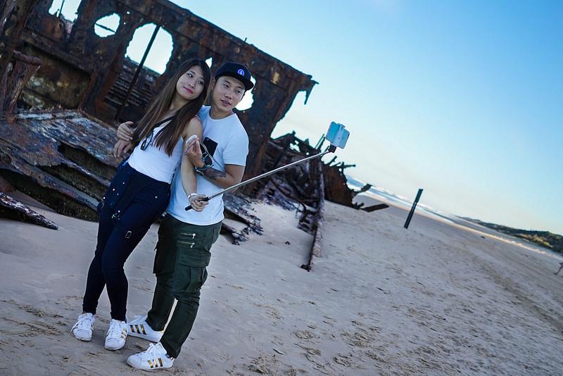 A titre d'exemple, je partage ci-dessous deux photographies. La première montre un couple asiatique posant au bout de leur selfie stick devant l'épave du Maheno sur l'ile de Fraser en Australie. La seconde a été prise dans les montagnes de Sanqingshan, où deux jeunes Chinois pratiquent le selfie avec la technique old-style du téléphone retourné.
