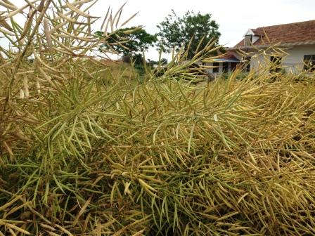 Une ferme derrière du colza - Les longues gousses vert tendre sont celles qui servent à fabriquer l'huile Crédit Photo CC