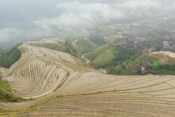 Arrivés au sommet du village, nous déposons nos bagages dans notre hôtel de charme, au cadre rustique et chaleureux. De là nous partons à la découverte des rizières environnantes qui s'échelonnent en terrasse sur les flancs de la montagne et forment un superbe paysage. C'est sous un temps très brumeux que nous découvrons ce magnifique paysage, sûrement plus riant quand les collines irradient du jaune du colza contrastant avec le vert profond des rizières. En ce mois de novembre, l'eau des plateaux de rizières forme un miroir aux nuages du ciel, c'est aussi magique… De la crête, nous atteignons deux terresses qui offrent une vision panoramique sur les rizières superposées les unes sur les autres.
