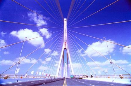 NANPU, le pont qui fait tourner les têtes Pont à haubans, il fut le premier pont à suspension d'une portée supérieure à 400 mètres Chine lors de son inauguration en 1991. Il possède six voies de circulation et deux pour piétons. Il tire son originalité d'une de ses extrémités qui débouchent sur une autoroute circulaire permettant une circulation fluide, avec une pente confortable, tout en réduisant au minimum l'utilisation de l'espace urbain.