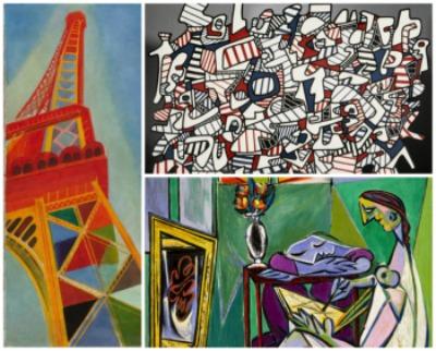 De gauche à droite, de haut en bas : La Tour Eiffel de Robert Delaunay, Site agité de Jean Dubuffet, La Muse de Pablo Picasso (*)