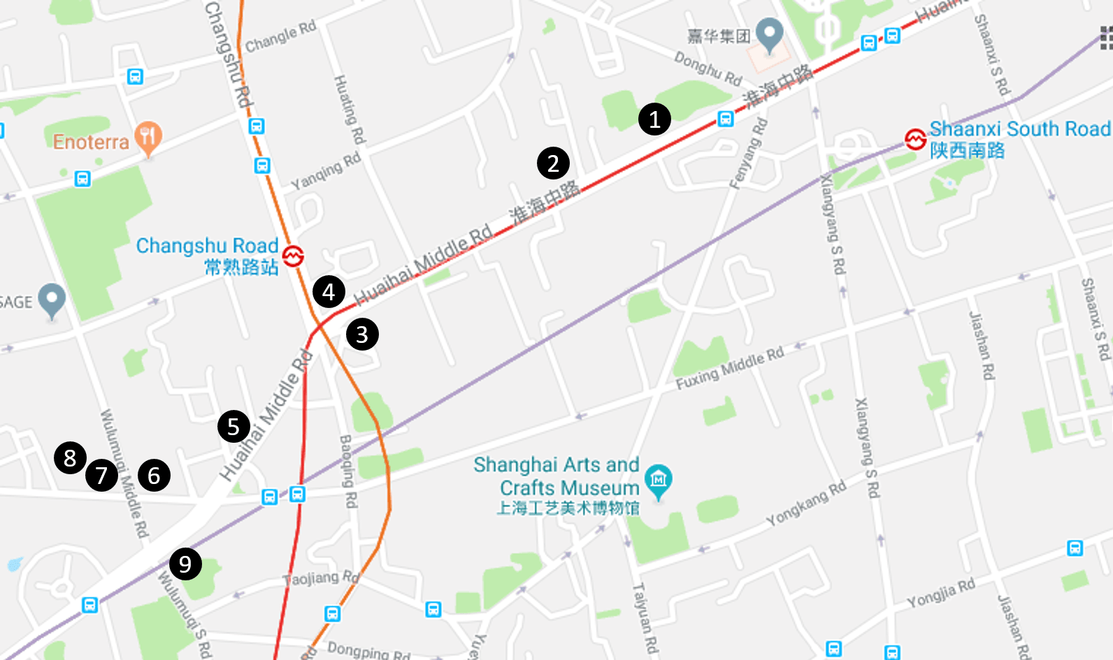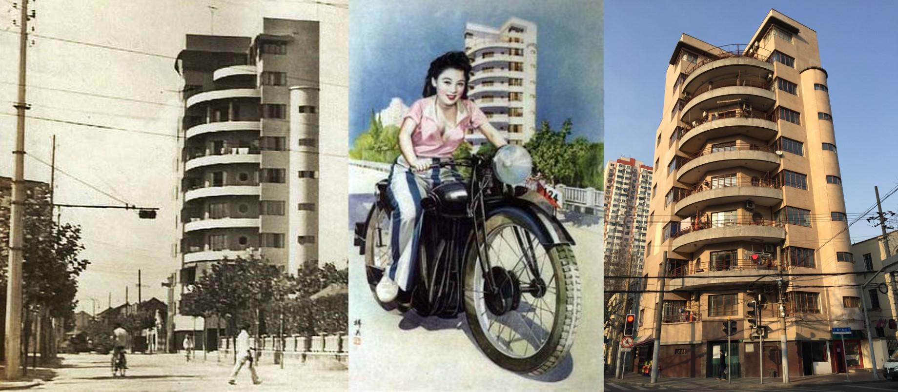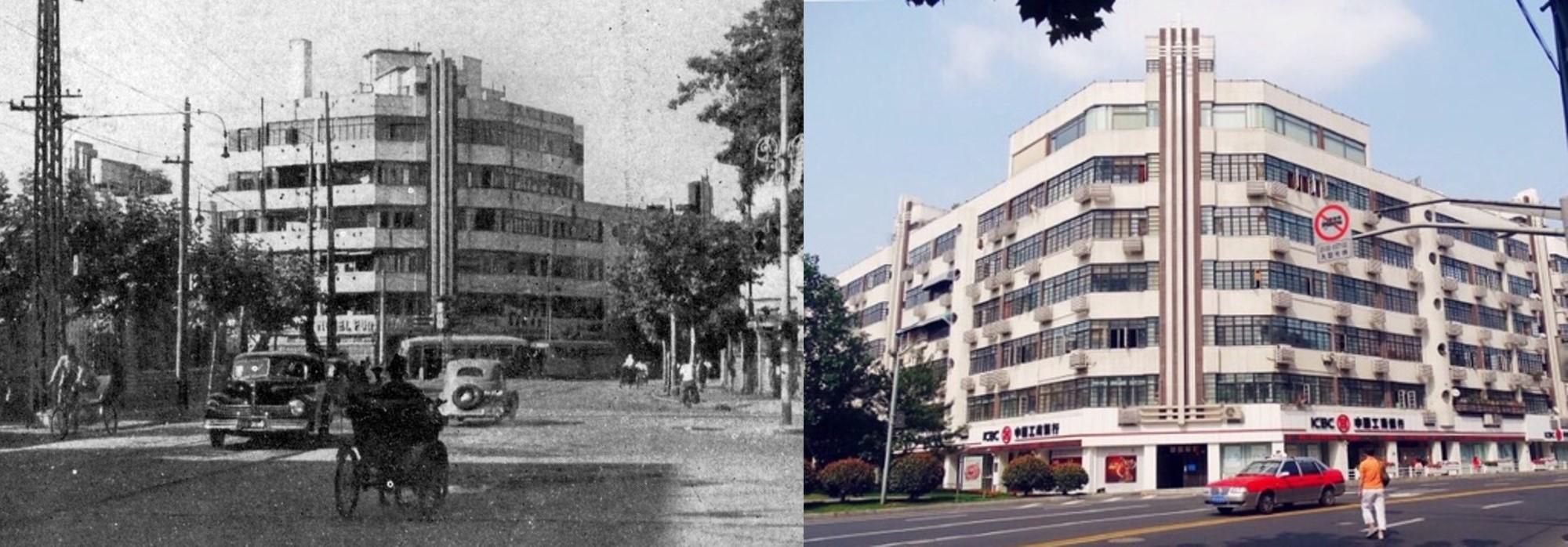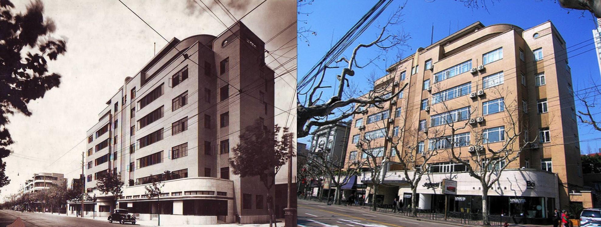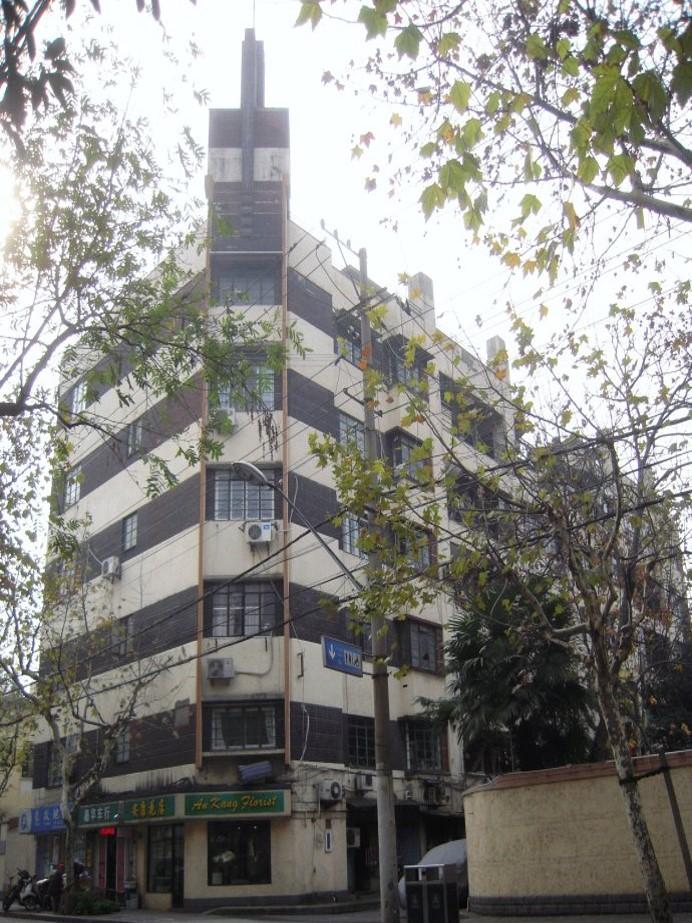 1. Dirigez-vous vers l’Ouest. Traversez Xiangyang Lu, puis Fenyang Lu. Au bout d’à peine 100m vous allez déjà apercevoir le premier bâtiment notable de notre visite. Au 1162 Huaihai Lu, avec sa façade carrelée de couleur ocre, voici un de ces appartements de luxe qui existait sur l’Avenue Joffre. Il s’agit de l’Hanray Apartments. La dénomination « Hanray » vient du couple Hanna et Ray Joseph, commanditaires du bâtiment, et qui avaient leur maison juste à côté, au croisement de Huaihai Lu avec Donghu Lu (aujourd’hui le Donghu Hotel). On apprécie particulièrement bien l’Hanray depuis le trottoir d’en face. Admirez la parfaite symétrie de ce bâtiment dessiné par Alexandre Léonard en 1939. Voyez le jeu de lignes horizontales et verticales au-dessus de la porte d’entrée, puis les formes effilées au sommet de l’immeuble. Voici un magnifique exemple d’architecture Art Déco !