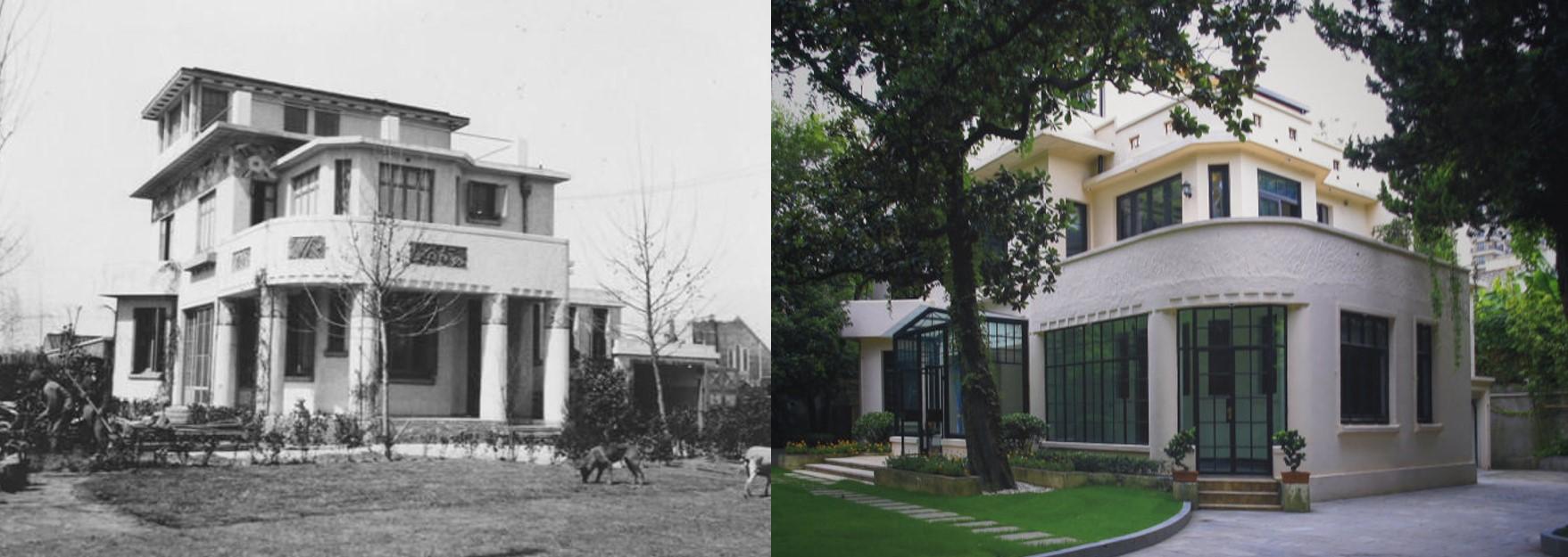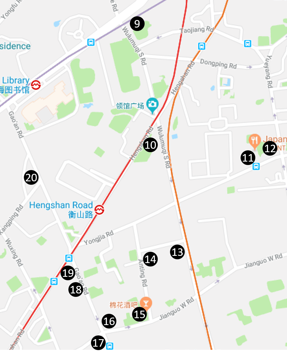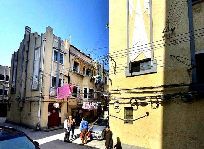 16. Ainsi désaltérés, engageons-nous maintenant dans la dernière partie de notre promenade, et allons observer de plus près les autres développements immobiliers de Léonard et Veysseyre, financés par la Foncim. Quittez le Cotton’s et prenez sur votre droite Jianguo Lu (direction Ouest). Au croisement avec Gao’an Lu, vous allez apercevoir trois maisons identiques au Cotton’s, mais qui sont toutes dans un état bien différent. L’une au coin Nord-Est a été restaurée (y-compris son jardin) et a retrouvé toute sa splendeur. Une autre, au coin Nord-Ouest, est un véritable témoignage du temps qui passe : elle reste occupée par un nombre important de familles, sans avoir été réparée depuis 1949. Enfin, bien cachée et de dos, vous pourrez apercevoir une troisième villa au coin Sud-Est.