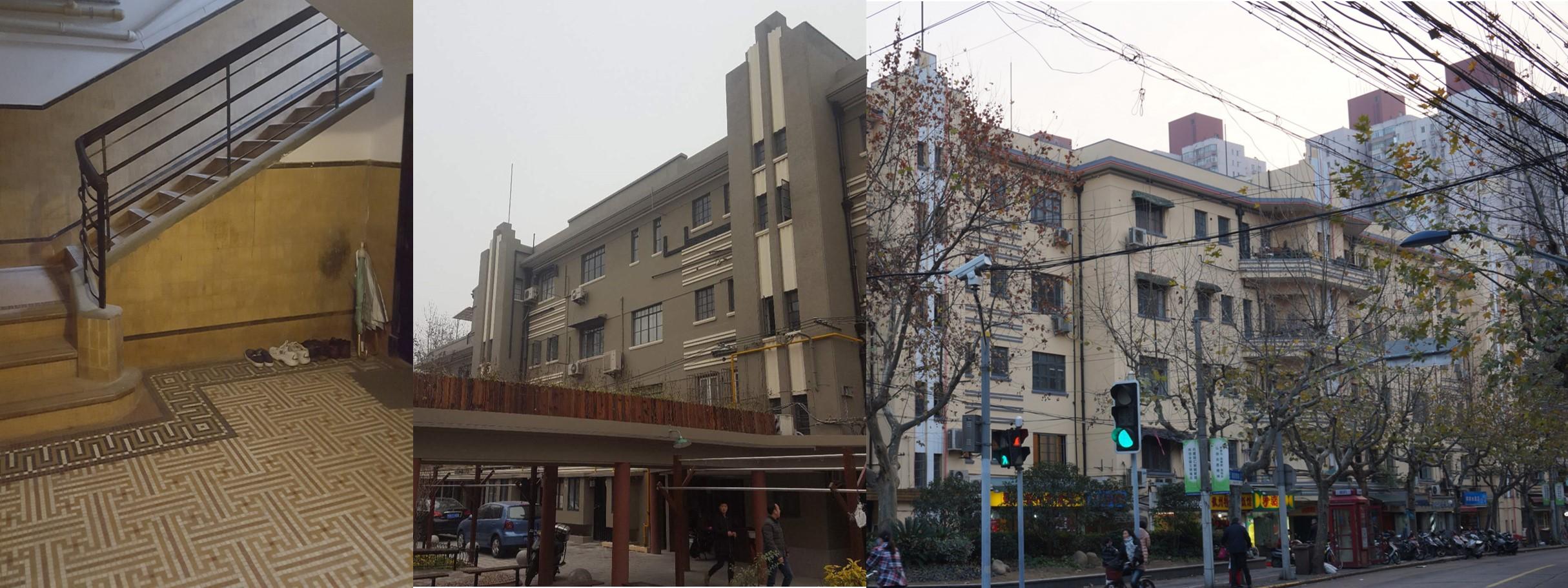 17. Dirigez-vous maintenant vers l’immeuble qui fait le coin Sud-Ouest (78 Gao’an Lu). Vous voici au niveau d’un joyau ignoré : le Foncim (le nom ne vous étonnera pas), une vraie merveille d’Art Déco, dessinée par Léonard et Veysseyre. Vous allez pouvoir y pénétrer soit en passant par une des portes donnant sur Jianguo Lu, soit en vous faufilant dans la cour à partir de Gao’an Lu. Le Foncim est composé de deux bâtiments : le premier, peint en jaune, donnant sur Jianguo Lu fait de quatre étages, le second, peint en gris, fait de trois étages. C’est en se promenant dans la cour intérieure qu’on se rend compte du travail de nos architectes. La symétrie de chaque structure est parfaite. Les doubles flèches leur donnent une prestance toute particulière. Mais surtout, partez à la recherche des décorations. Les mosaïques au sol des cages d’escalier valent qu’on s’y attarde : tricolores, faites de motifs géométriques, elles sont particulièrement bien conservées.