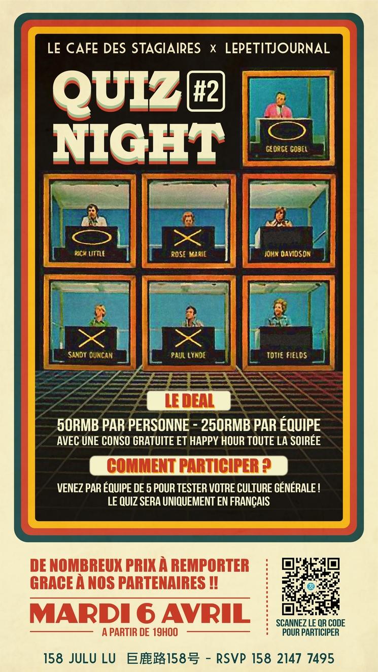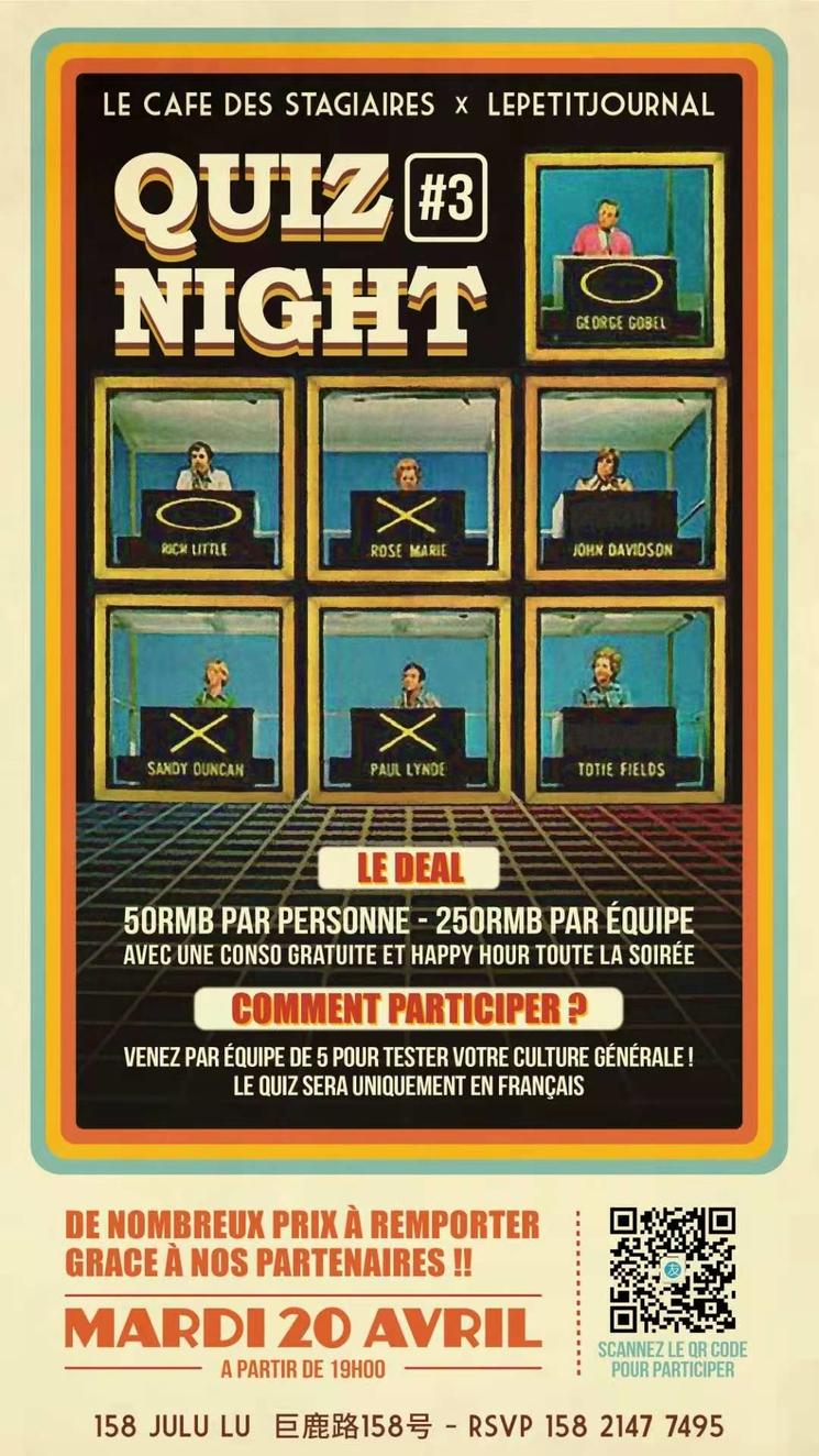 Le 6 avril, à partir de 19h. Café des Stagiaires, Found 158, 158 Julu lu. 250 RMB par équipe de 5 (50RMB/personne) avec une conso offerte par personne !