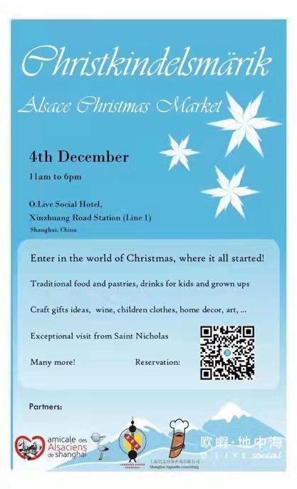 L'Amicale des Alsaciens de Shanghai et Lorraine Power Shanghai organisent leur marché de Noël ! Au programme : Saint Nicolas, vin chaud, shopping, activités pour les enfants, cuisine traditionnelle et snacks,... Le Marché de Noël sera suivi d'une soirée.