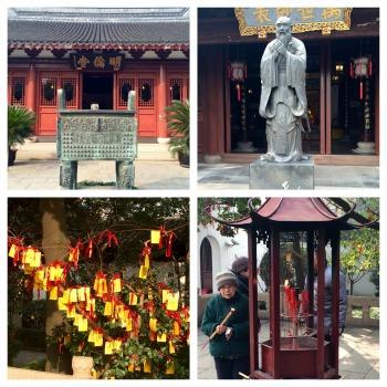 Après avoir admiré l'imposante statue de la salle principale (Da Cheng hall), aux murs couverts d'écrits confucéens, nous découvrons sur la droite, derrière les arbres ornés de v?ux sur papiers et rubans jaunes, un passage vers une autre cour, une galerie ornée de pierres, la salle d'étude, des charmants pavillons, une pagode et le reflet des bâtiments dans le plan d'eau. Un style délicat, proche de celui du Yuyuan garden, avec les touristes en moins ! La boutique expose de nombreux trésors et donations de théières anciennes notamment, les ventes étant destinées à des ?uvres de charité et à l'entretien lieux. Revenant dans la cour Da Cheng, de l'autre côté, le pavillon Weng Chan propose une démonstration de cérémonie du thé avec dégustation (et achat possible à la fin bien sûr). Beaucoup de bienveillance et d'échanges chez toutes les personnes au service de ce temple. Une belle expérience que cette visite chez Confucius? Si vous y allez, demandez à voir Jasmin !