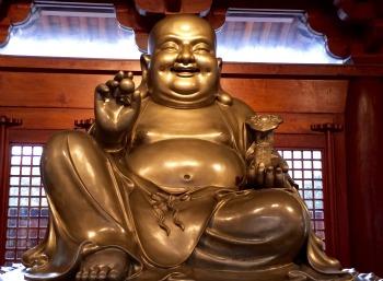 Drapé dans une enveloppe dorée et clinquante, il tente de ne pas se faire dévorer par les buildings de bureaux et shopping centers, par le trafic intense, les carrefours bruyants et routes surélevées des environs... Que l'on soit sensible ou non à son style bling-bling, avouons-le, le temple bouddhiste de "la Paix et la Tranquillité" a bien du mérite ! Son histoire agitée de près de 800 ans, avec déplacement et incendie, a fini par le faire accéder à la protection patrimoniale nationale, pour être rouvert au public en 1990. En passant la porte, c'est la surprise ! Tout d'abord par le style architectural, beaucoup plus sobre que côté rue : les bâtiments et cours allient harmonieusement pierre grise et bois. Certes l'intérieur des salles reste impressionnant avec ses immenses bouddhas et autres statues dorées. Un bouddha de plus de 3 mètres de haut domine la salle Mahavira, mais son expression sereine et souriante est apaisante.