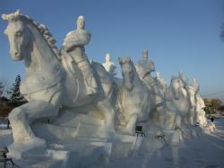 En traversant le fleuve à pied, nous gagnons le parc de l'île du soleil, aire de loisirs de 3.800 ha qui regroupe des jardins, forêts et un parc "aquatique" où a lieu l'exposition des statues de neige. Nous prenons nos billets et sommes accueillis par de gros ours de neige. Ce sont les tous premiers jours de cette exposition et nous voyons encore des ouvriers au travail qui terminent les dernières ?uvres. La neige fabriquée par des canons à neige s'entasse et est ramassée avec une pelleteuse pour l'entasser dans un camion qui dépose la neige à l'endroit approprié. Elle est alors déchargée à la pelle ou à la benne pour remplir des coffrages de bois dont la taille dépend de la statue à réaliser. Certaines sont monumentales et la neige est entassée sur plusieurs étages, d'autres, les plus petites, forment un cube de trois mètres de côté environ. Quand la neige est suffisamment tassée, les coffrages sont retirés et le travail de sculpture peut commencer. Pour les ?uvres les plus importantes, les hommes grimpent et commencent le travail à la pelle. Pour les blocs plus petits, un artiste, seul ou assisté s'occupe des détails?..Et les réalisations sont tout simplement impressionnantes! Nous ne savons plus où orienter nos appareils photo. Nous sommes absolument sidérés lorsque nous voyons l'?uvre centrale du parc : elle doit s'étendre sur une centaine de mètres et une hauteur d'au moins 6 mètres. Sur la droite, elle représente les chutes du Niagara qui viennent "arroser" une piste de patinage aménagée à la base et sur sa gauche, elle représente une colonne d'indiens se déplaçant à cheval. Le tout est agrémenté d'animaux plus vrais et plus grands que nature : cerfs, loups, etc. C'est magnifique, absolument grandiose et spectaculaire, nous n'avons jamais rien vu de tel.