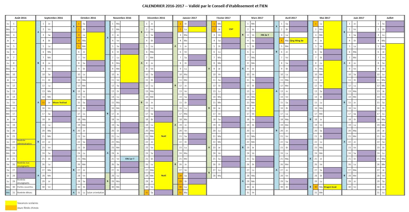 Le Lycée Français de Shanghai vient de publier le calendrier de l'année scolaire 2016-2017. Vacances françaises, fêtes et jours fériés chinois : toutes les dates nécessaires pour anticiper au mieux sur les congés de l'année prochaine.