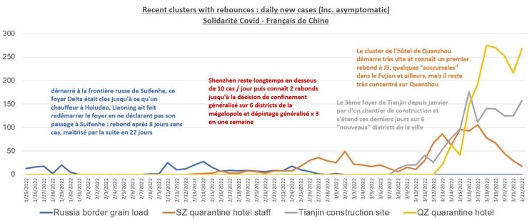 Issue de la base de données exclusive des clusters constituée jour après jour avec l’aide précieuse de Claire Jiang. Accélération du nb de nouveaux foyers en décembre, puis cela crante à nouveau en février. En mars, nouvelle progression du nb de nouveaux foyers et surtout du nombre de cas sur certains foyers (Jilin, Shanghai), mais espoir : la 3ème semaine de mars ne génère plus autant de nouveaux foyers, quasiment plus que des sous-foyers dans des « nouvelles » préfectures de foyers existants provenant des mégalopoles de Tier 1.