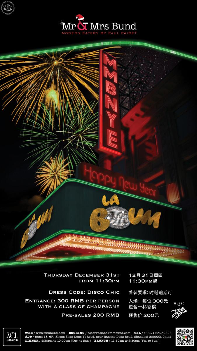 LA BOUM se déroule de 23h30 à tard. Célébrez en le nouvel an en grande pompe ! Joignez-vous à la pétillante fête de Mr & Mrs Bund pour accueillir une nouvelle année très attendue. Le code vestimentaire est le Disco Chic, avec une musique de John Avolio. Les 100 premiers billets vendus sont de 150rmb par personne, avec une coupe de champagne offerte. Tous les billets suivants sont de 200 rmb en ligne et de 300 rmb à la porte. L'inscription anticipée (limitée aux 100 premiers billets) est de 150 rmb ; ensuite, 200 rmb. C'est 300rmb à la porte.