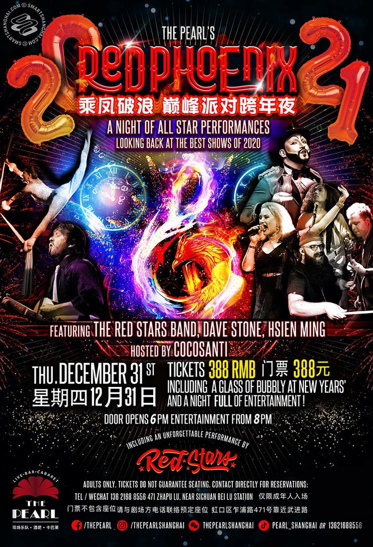 Dépoussiérez 2020 en portant vos beaux vêtements de fête et préparez-vous à être divertis par la troupe de vedettes du Pearl. Le Pearl présente sa dernière fête de 2020 avec une soirée pleine de surprises, de numéros musicaux, d'artistes invités, de bonnes victuailles et un festin visuel avec le régal audiovisuel de l'équipe de 808 Sound Machine. Des mets de saison préparés par le chef Baidas pour vos papilles. Les billets sont au prix de 388rmb, accompagnés d'un verre de mousseux à minuit. Les portes ouvrent à 18h, le happy hour est de 18h à 20h, et le spectacle et la fête sont à 21h. Des spectacles non-stop de 2020 à 2021 !