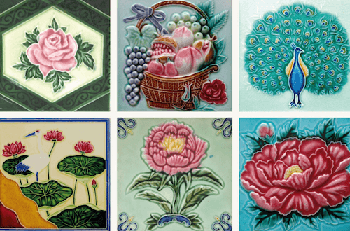Ces carreaux ornaient les façades et les intérieurs des riches maisons peranakan mais étaient-ils produits localement? Eh bien non, pas du tout. Les premiers carreaux sont importés à Singapour en 1891 et la demande se développe surtout au début du XXème. Ils sont importés très majoritairement de Grande-Bretagne et dans une moindre mesure de Belgique, des Pays-Bas et de France. Le Japon produit aussi des carreaux de grande qualité et la proximité géographique entre les deux pays favorise les échanges. Les riches familles chinoises et peranakan apprécient tout particulièrement l’émaillage de ces carreaux aux couleurs vives et brillantes. Ils sont également séduits par les motifs qui rappellent des symboles auspicieux chinois: certains fruits (grenade, raisins, pêche, ananas), des fleurs comme la pivoine et des oiseaux comme le paon ou la pie.