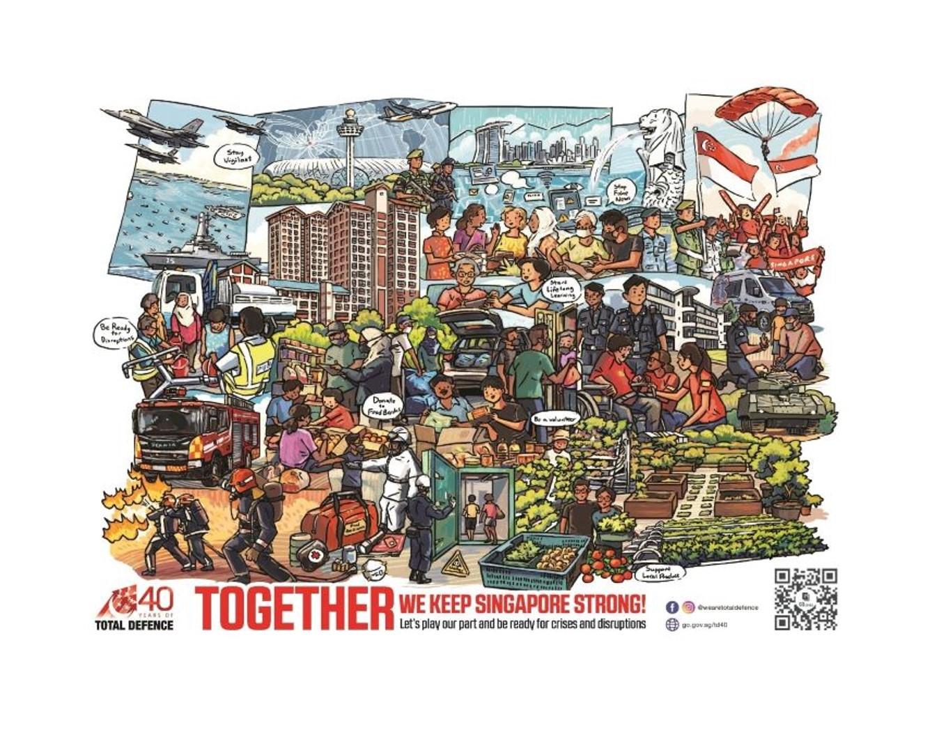 Le programme Total Defence s’appuie sur six piliers : la défense militaire (avoir une armée solide), la défense civile (préparation aux situations d'urgence comme les incendies ou les catastrophes naturelles), la défense économique (maintien d'une économie forte pour garantir les ressources et la stabilité pendant les crises), la défense sociale (promotion de l'harmonie raciale et religieuse pour l'unité nationale), la défense numérique (protection des infrastructures critiques de Singapour contre les cyberattaques), et la défense psychologique (renforcement de la résilience face aux menaces qui visent à affaiblir l'esprit national).