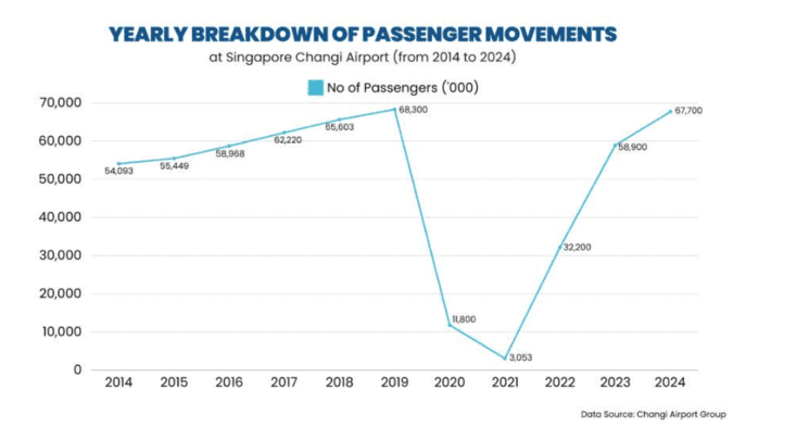 Comme tous les aéroports du monde, Changi a beaucoup souffert durant la pandémie. En 2021, le trafic a diminué de 95% par rapport à 2019. L’importance de cette chute résulte du fait que la totalité du trafic aérien de Singapour est un trafic international, donc soumis à plus de contraintes en période de pandémie. En 2024, avec 67.7 millions de passagers, dont environ 1% en transit, le trafic de l’aéroport de Changi est pratiquement revenu au niveau de 2019. Ce chiffre le place en 15ème position au niveau mondial en termes de trafic passagers total.