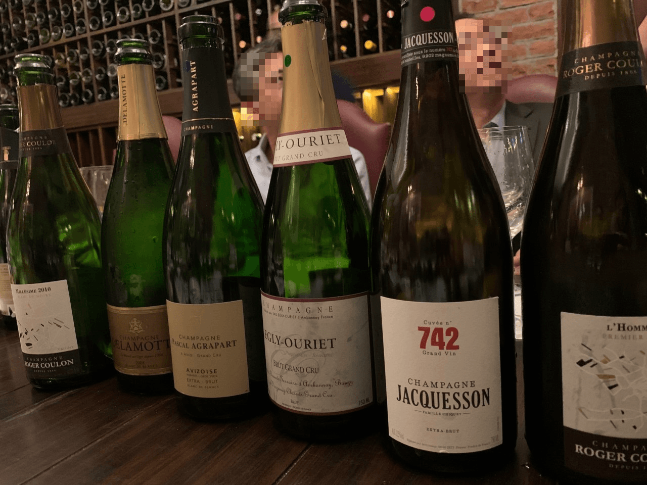 Afin de tester notre nez et nos papilles après ces explications fort intéressantes, six champagnes de différents terroirs, différents raisins et différentes teneurs en sucre nous ont été servis, sans en voir l’étiquette. Comme vous pouvez le voir, ils sont servis dans des verres et pas dans des flûtes. Stéphanie nous explique que la flûte est trop étroite pour pouvoir sentir le champagne avec tout son arôme. Tan Ying Hsien, notre « Master of Wine » s’est également prêté au jeu en nous décrivant ses impressions au fur et à mesure de ses dégustations. L’exercice n’était facile pour personne, même pour lui, mais nous avons passé un excellent moment organisé par Voilah!