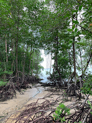 9h. Nous arrivons à Changi Village. La pluie nous a suivis, du centre-ville jusqu’au port. Nous décidons de petit-déjeuner sur place. Une boulangerie qui ne paie pas de mine propose, étonnement, des brioches succulentes. Le temps s’améliore, le retour en arrière n’est plus admis, nous embarquons à bord d’un petit bateau. 3 SGD, c’est le prix pour un aller simple, assurez-vous d’avoir de la monnaie. Une dizaine de minutes plus tard, nous posons les pieds sur la terre ferme, l’aventure commence. Plusieurs personnes nous proposent leurs services, c’est le marché du vélo. Pour 8 SGD, nous trouvons notre bonheur. En selle la compagnie, nous pédalons. Plusieurs chemins sont proposés, tous promettent tranquillité et verdure.