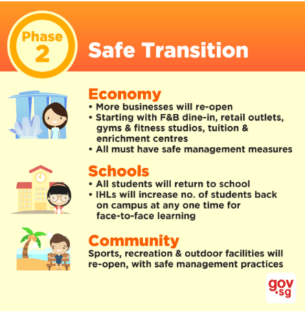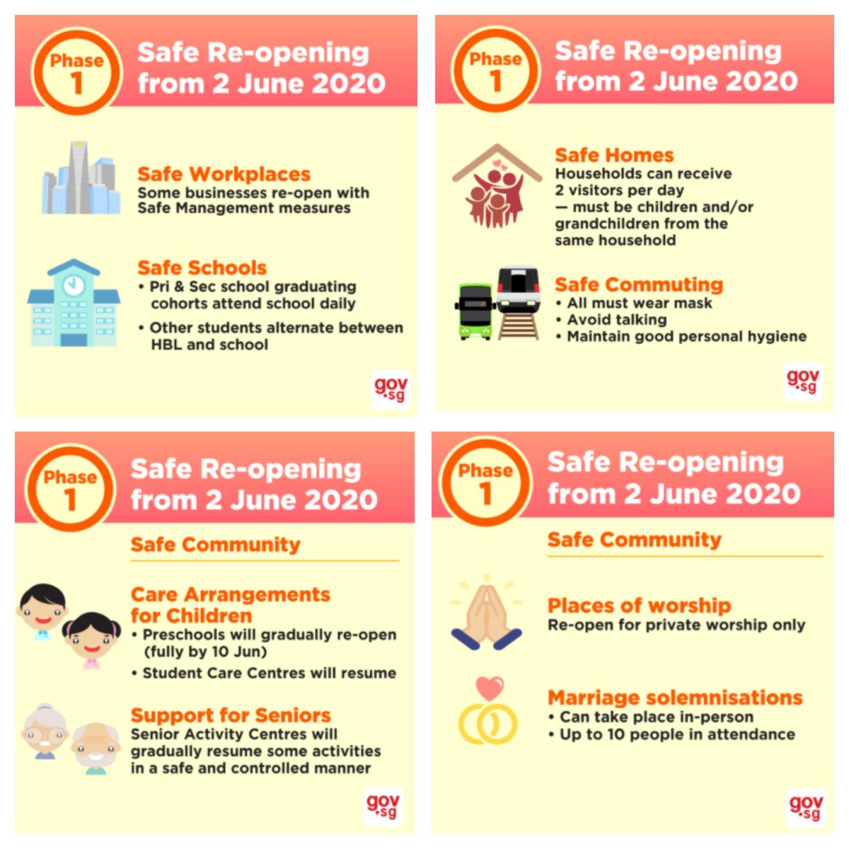 Les écoles maternelles rouvriront progressivement à partir du 2 juin, date de la reprise du second semestre du calendrier scolaire de Singapour. Dans la phase 1, les élèves en dernière année du primaire et du secondaire seront également autorisés à retourner à l'école en semaine, tandis que les autres effectueront une alternance entre l'apprentissage à domicile et le retour à l'école. Les activités parascolaires ne reprendront pas afin d’éviter le mélange de population.