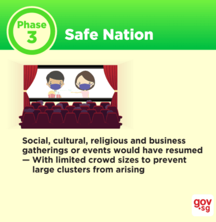 Singapour rouvrira progressivement ses frontières avec des garanties en place pour permettre aux résidents de Singapour de mener des activités essentielles à l'étranger et pour les étrangers d'entrer et de transiter par le pays. Cette réouverture des frontières de Singapour sera évaluée et mise en œuvre séparément du calendrier des trois grandes phases de réouverture car la situation mondiale reste "volatile".
