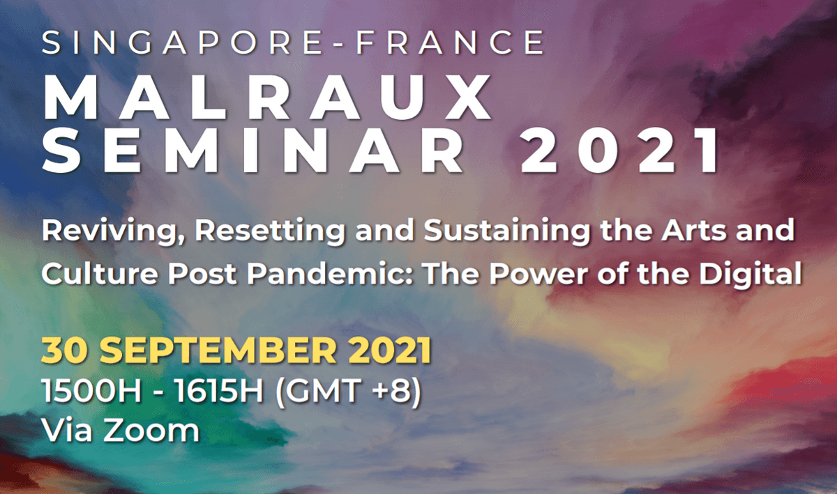 L'Ambassade de France a le plaisir de vous annoncer le Séminaire Malraux 2021 qui se déroulera virtuellement le jeudi 30 septembre 2021 à partir de 15h. Organisé conjointement par The Culture Academy Singapore, le ministère de la Culture, de la Communauté et de la Jeunesse de Singapour, le ministère français de la Culture et l'Ambassade de France à Singapour, le séminaire Singapour-France Malraux explorera les possibilités de mieux impliquer nos communautés créatives et culturelles sur l'élaboration des politiques culturelles et discuter de nouvelles façons d'imaginer et d'innover. La pandémie changeant la façon dont les arts et la culture sont produits, consommés et présentés, nous nous concentrons actuellement sur la relance, la réinitialisation et le maintien du secteur après la pandémie.