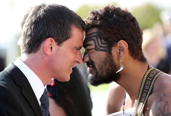 Une alternative du « nez-à-nez » existe à l'autre bout du monde, en Nouvelle-Zélande. Les Maoris se pressent leur nez et leur front respectifs. Cette salutation est surtout pratiquée dans les cérémonies officielles et autres rencontres majeures. Comme le rappelle l'Encyclopédie officielle de la Nouvelle-Zélande l'origine de ce geste remonterait à la création légendaire de la première femme, Hine ahu one, (« femme faite de terre ») par Tane, un dieu qui lui aurait insufflé la vie par les narines. Le « hongi » serait donc un échange de ce souffle de la vie, le « ha ». A l'issue de ce salut physique, le visiteur est accepté par le peuple, invité à partager les responsabilités et les devoirs des membres du pays qui l'accueille. Ainsi en mai 2016, Manuel Valls, en visite officielle à la Nouvelle-Zélande, avait dû se prêter au jeu de la tradition et effectuer un « hongi ».