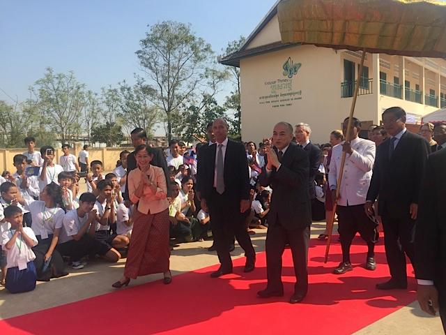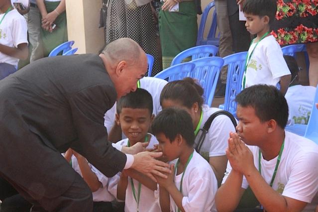 Le Roi du Cambodge, son Altesse Norodom Sihamoni, saluant les enfants de Krousar Thmey