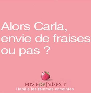 A la Une de Libération du lundi 9 mai, une publicité rose bonbon interpelle directement Carla Bruni-Sarkozy. La marque de prêt-à-porter pour femmes enceintes interroge : "Alors Carla, envie de fraises ou pas ?", en référence au nom de la marque. "Notre publicité ne fait que surfer sur un 'scoop en gestation' et poser une question simple et complice", explique le responsable de l'agence de pub, François Belley. Avant d'ajouter: "Puisque la question est adressée à Carla, nous attendons maintenant sa réponse".