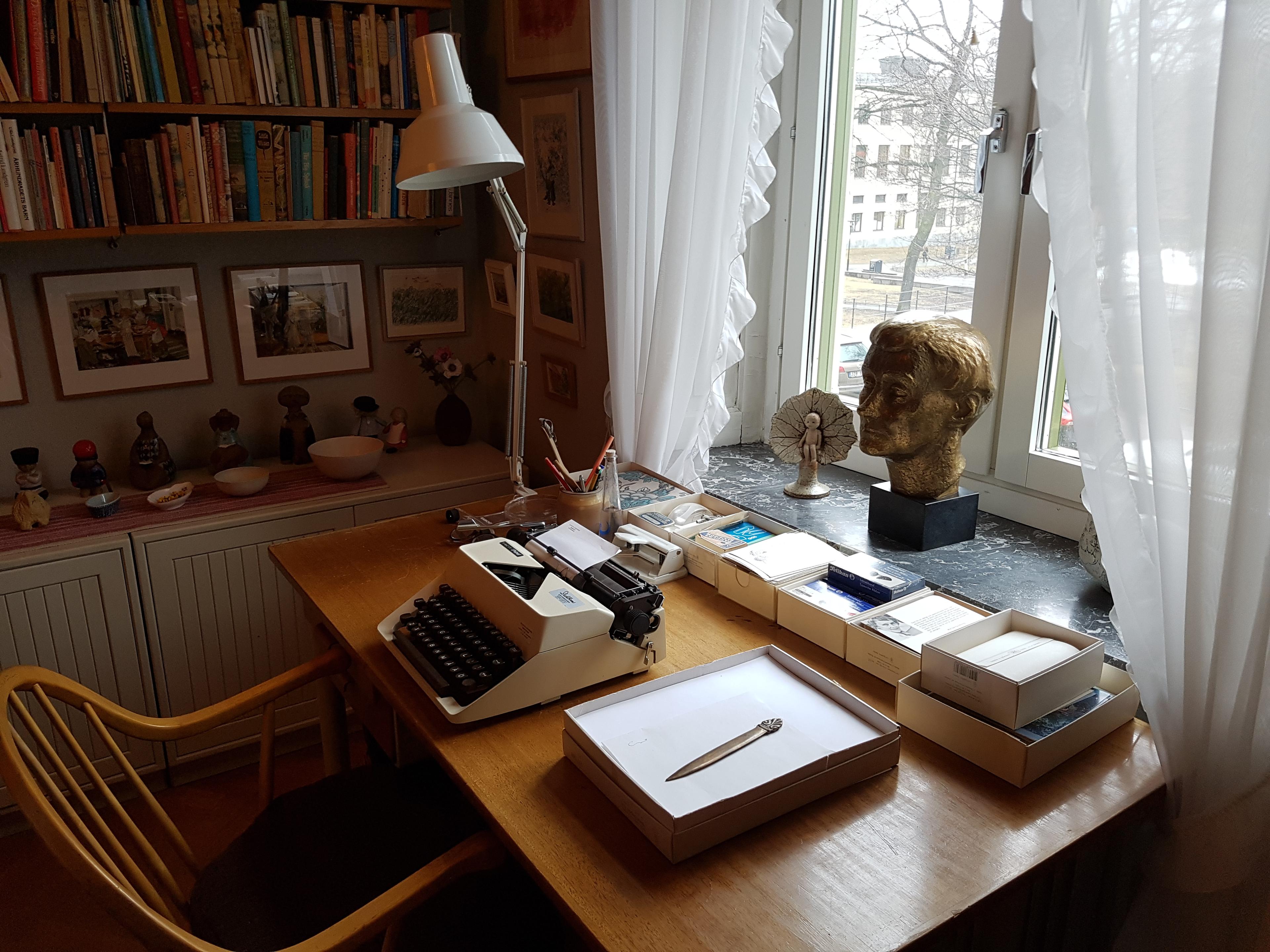 Derrière cette pièce se trouve le bureau d'Astrid qui avant de devenir le lieu de travail de l'auteur avait rempli plusieurs autres fonctions (chambre de son fils Lars, puis de sa fille Karin lorsque Lars avait quitté le nid familial). C'est dans cette étude qu'Astrid Lindgren tapait à la machine, répondait à sa correspondance, écoutait de la musique, regardait la télévision. Y sont rassemblés différents objets et figurines des personnages principaux de ses livres, lithographies et livres. Lors de ses débuts, Astrid a été sténographe et secrétaire, tous ses manuscrits sont sténographiés, ce qui rend le déchiffrage plus difficile.