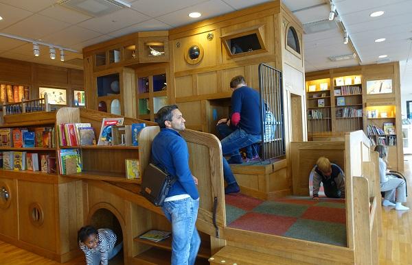 En revanche rien n'évitera la crise de larmes au moment de la séparation d'avec le canidé en bois, pas même le sourire compatissant des Suédois. L'espace suivant s'adresse aux enfants qui ne lisent pas encore seuls et qui de fait se lassent assez vite. Au milieu des rayonnages se dresse une sorte de citadelle : tunnel obscur, escalier, rampe glissante, petit banc en hauteur? pour jouer à cache-cache et se faire peur entre deux histoires.