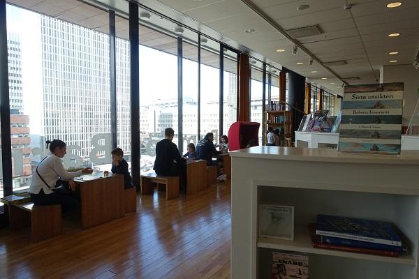 Si jamais votre visite s'éternisait (et c'est souvent le cas), sachez qu'il est possible de prendre le goûter au milieu de cette bibliothèque. Le hic c'est que le coin goûter (équipé d'un micro-onde et de chaises hautes) est situé dans une pièce sans lumière naturelle juste à côté des toilettes. Il sera plus agréable de descendre au Teater Baren.