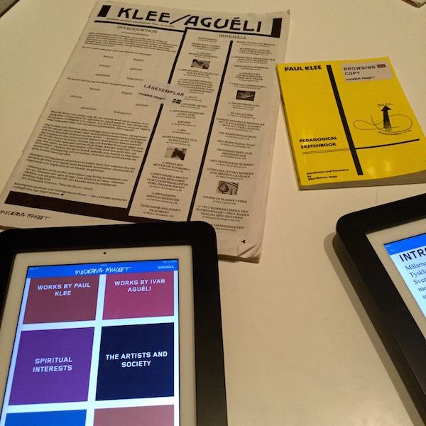 Mais pour ceux qui voudraient en savoir plus, il est possible de se procurer un journal à l'entrée de l'exposition pour 40 kr et s'imprégner de textes écrits par les artistes ou en rapport avec les thèmes abordés dans l'exposition. Pour ceux qui souhaitent une approche plus traditionnelle, on peut télécharger l'application Moderna Museet Klee/Aguéli qui fait office de catalogue d'exposition, grâce au wifi dans le hall du musée, ou sur des iPads mis à disposition dans la dernière salle de l'exposition, où l'on peut également lire d'autres livres ainsi qu'une chronologie littéralement linéaire, qui court sur trois murs.