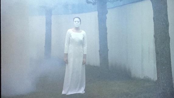 Sur un grand écran, une autre femme vêtue d'une longue robe blanche nous tourne le dos, debout dans un jardin ceint d'un haut mur blanc. Une épaisse brume l'enveloppe. De l'autre côté de l'écran, la même femme, de face, le visage maquillé de blanc. Le maquillage efface ses traits mais fait ressortir le noir de ses cheveux et des yeux, la courbe du nez et celle des lèvres, tombantes ? elle ne sourit pas. Elle reste immobile, impassible, telle une statue.