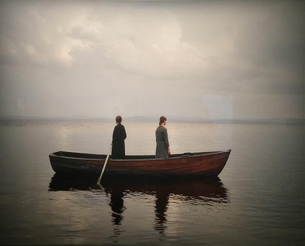 Deux femmes debout, dans une barque, se tournant le dos. L'air gris autour d'elles, le reflet de la barque dans l'eau et l'atmosphère mélancolique évoquent les ambiances des films de Jane Campion. Les bras ballants, les femmes semblent laisser derrière elles quelque chose de lourd et regarder vers les terres qui apparaissent, bleutées, à l'horizon. La barque est posée comme un tiret, entre le passé, au premier plan, et l'avenir, en arrière-plan. Les deux femmes sont dans l'instant présent, immobiles, comme si elles prenaient une pause prolongée. Car parfois on peut ressentir le besoin de se poser, de reprendre des forces, de se retrouver avec soi-même avant de continuer son chemin.