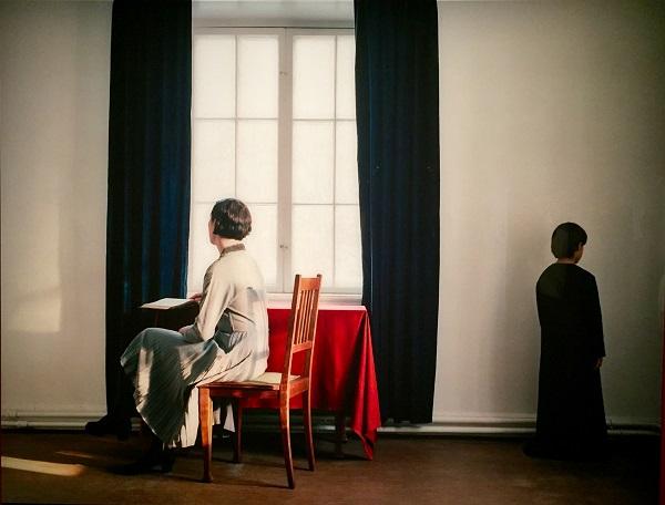 Une femme assise de trois-quarts, le dos droit, face une table couverte d'une nappe rouge, devant une fenêtre qui laisse entrer une lumière diaphane ; à droite un petit garçon qui semble être mis au coin. Tous les deux tournent le dos aux spectateurs. Dans cet espace intemporel où le silence règne, la photographe nous laisse seuls avec nos questions. Aucun indice ne laisse supposer quoique ce soit. La composition simple, les ombres, la calme solitude : on croirait un tableau peint par Vermeer.