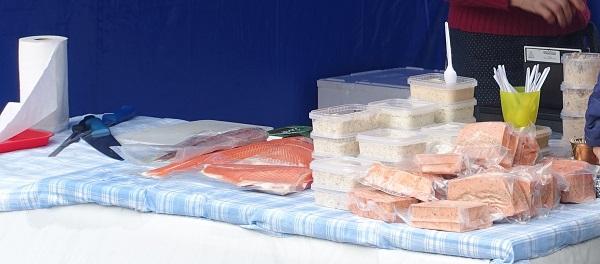 ?ufs, 30kr les 6. Patates, 20kr/kg. Carottes, 25kr/botte. Baguette, 35kr. Filet de saumon, 135kr/kg. Chèvre frais, 38kr/hg. Girolles, 25kr/hg. Myrtilles, 75kr/kg. Miel 150kr/kg.