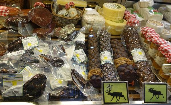 Dès l'entrée, des têtes empaillées signalent les bouchers et charcutiers. Suède oblige, la viande d'élan et de renne est présente sous plusieurs formes : saucissons, saucisses viande séchée. Il y a même un étal consacré au gibier : lièvre, daim, chevreuil, coq de bruyère... tout ce qui peut se chasser est chez B.Anderssons.