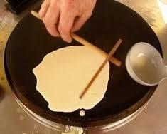 Cela parait facile de faire des crêpes sur une galetière, cette espèce de grande poêle en fonte sans bords, mais c'est en fait toute une technique à acquérir. Franchement, je ne pensais pas avoir besoin d'une semaine entière pour apprendre et je ne peux toujours pas dire que j'ai la main. Pour confectionner une crêpe, on utilise un « rozell », une sorte de petit râteau en bois destiné à tirer la pâte, déposée sur le côté de la plaque, vers le centre de la galétière. C'est un travail de rotation du poignet qui n'a en fait rien à voir avec la confection des crêpes à la poêle. C'est un peu comme faire du vélo : il y a un déclic suite auquel il faut s'entrainer.