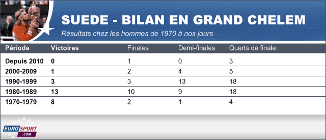 Durant l’ère Open, quatre joueurs suédois ont remporté un tournoi du Grand Chelem : Björn Borg (11 titres), Mats Wilander (7 titres), Stefan Edberg (6 titres) et le dernier en date Thomas Johansson, vainqueur surprise en 2002 de l’Australian Open. Depuis, malgré les performances ponctuelles de Magnus Norman, ex-numéro 2 mondial, ou dernièrement de Robin Söderling, double finaliste de Roland Garros, aucun joueur suédois n’est parvenu à briller sur la grande scène du tennis mondial. Les résultats en Coupe Davis, intimement corrélés à cet irrémédiable déclin, accentuent un peu plus ce constat d’échec :
