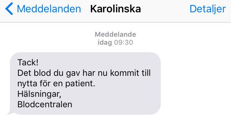 Mais la plus belle récompense est certainement le SMS que vous recevez un peu plus tard, vous informant qu'un patient a reçu votre sang. C'est un coup de génie de la part du Blodcentral : cela ne leur coûte pas grand-chose, encourage les donneurs de sang à revenir, et pour peu qu'ils partagent ces SMS sur les réseaux sociaux, ils peuvent potentiellement recruter de nouveaux donneurs.
