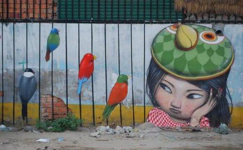 Quelques peintures sur les murs commencent à apparaître dans les rues de Phnom Penh. Derrière l'hôtel Intercontinental, sur le mur de l'Ambassade de France, à la Metahouse, près du marché russe, on peut apprécier l'art de Seth, Julien Malland de son vrai nom. A l'occasion des 20 ans de l'Institut Français, ce street artist qui s'inspire de la culture traditionnelle khmère vient ajouter ses couleurs à celles de la capitale