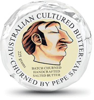 Il s'agit bien là du meilleur beurre que vous pourrez trouver en Australie, fait localement mais avec un gout divin de beurre français. Le secret de PEPE SAYA ? Un beurre fait avec du bon lait local. La crème fermente pendant 24 heures et son affinage est d'au moins trois semaines. Les ferments avalent alors le sucre de la crème et la transforme en acide lactique (la crème ?tourne?) ce qui développe les saveurs et donne au beurre tous ses propriétés, le rendant encore meilleur ? car le bon beurre c'est bon pour vos papilles mais c'est aussi bon pour vous !