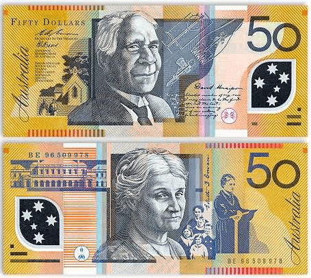 Sur le recto du billet de $50 figure le portrait de David Unaipon (1872-1967). Écrivain, conférencier et inventeur, il a apporté, au cours de son existence, d'importantes contributions à la science, la littérature, et à l'amélioration de la situation des populations aborigènes.